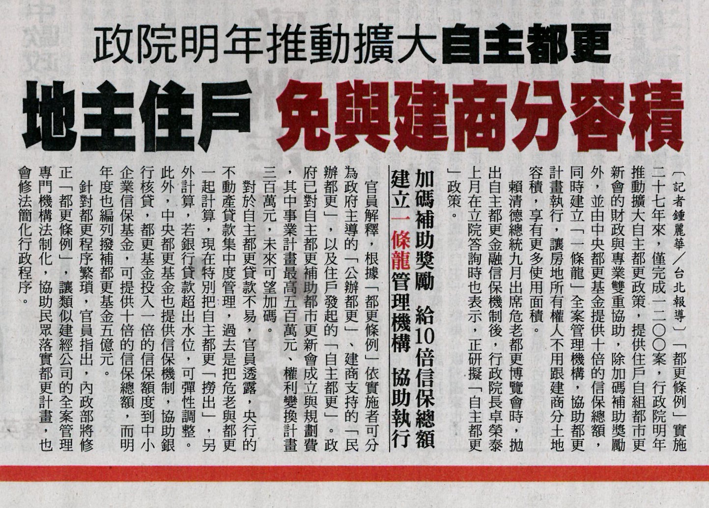 政院明年推動擴大自主都更 地主住戶 免與建商分容積