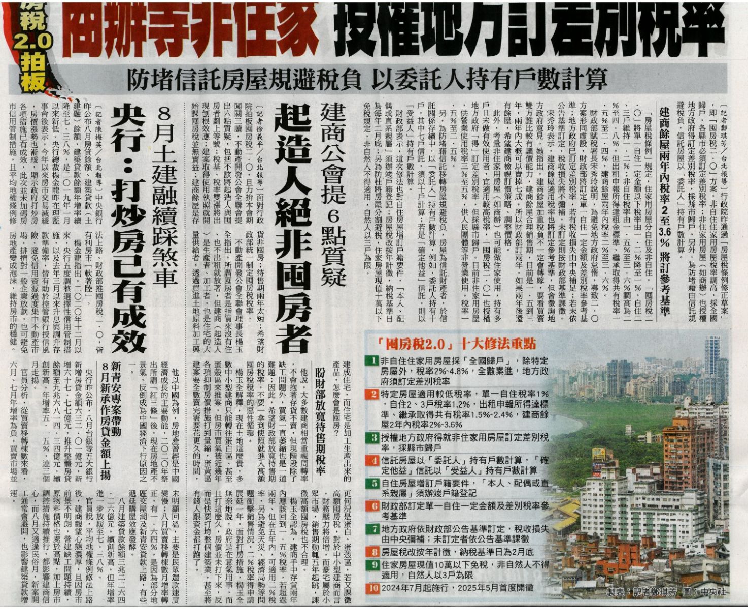 宋秀玲表示,建商餘屋適用稅率也將訂定參考基準,但會徵詢地方政府意見。她指出,建商餘屋加重稅負不一定會轉嫁,要看買賣雙方誰比較有議價能力,建商餘屋合理銷售期,目前是一.五到三年,兩年內大概可以賣掉七成,所以財政部訂兩年,如果兩年後還有餘屋,希望建商檢視訂價策略、調整價格。