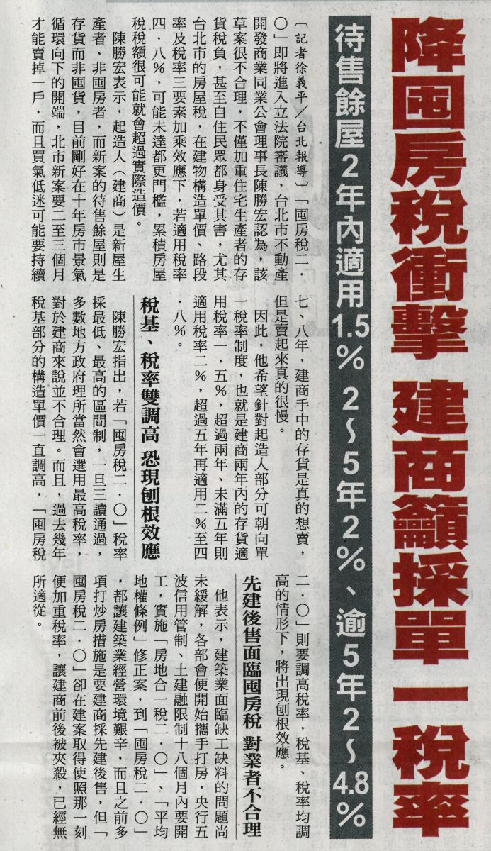 〔記者徐義平/台北報導〕「囤房稅二.O」即將進入立法院審議,台北市不動產開發商業同業公會理事長陳勝宏認為,該草案很不合理,不僅加重住宅生產者的存貨稅負,甚至自住民眾都身受其害,尤其台北市的房屋稅,在建物構造單價、路段率及稅率三要素加乘效應下,若適用稅率四.八%,可能未達都更門檻,累積房屋稅稅額很可能就會超過實際造價。