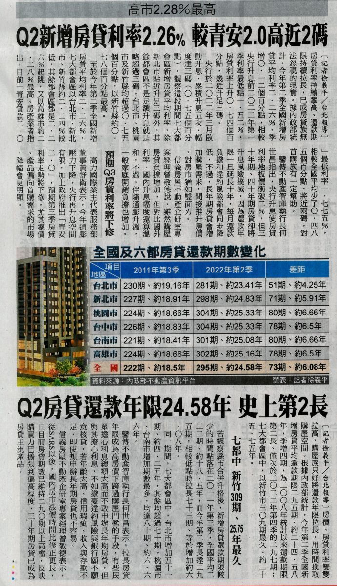 〔記者徐義平/台北報導〕房貸利率持續攀高、還款期限持續拉長,已成房貸族無法忽視的現實。據內政部統計,今年第二季全國新增房貸平均利率二.二六%、季增O.一二個百分點,相較央行升息前二O二二年第一季利率最低點一.五二%,房貸利率上升O.七四個百分點,幾近升足三碼。
