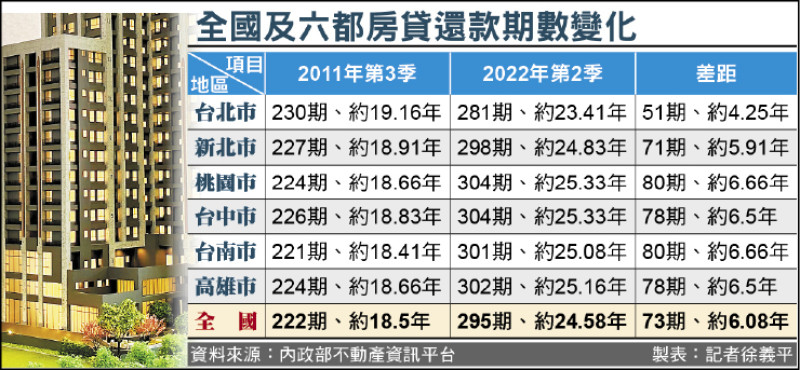 若觀察縣市合併升格後,新增房貸還款期限較少的時間點落在二O一一年第三季,全國平均二二二期、約十八.五年,而今年第二季長達二九五期,相較低點時拉長七十三期、等於增加約六.O八年。