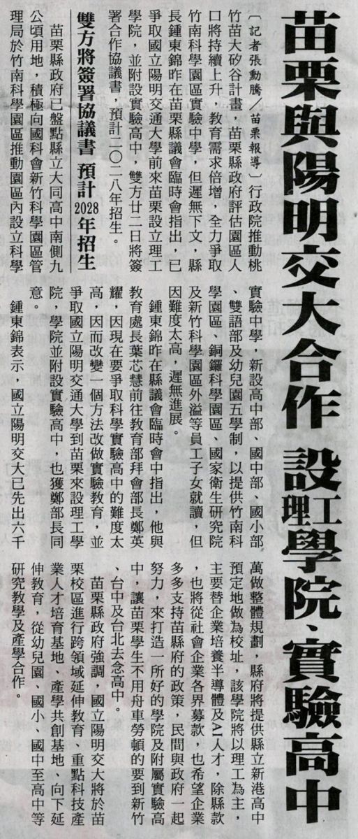 苗栗與陽明交大合作 設理工學院、實驗高中
