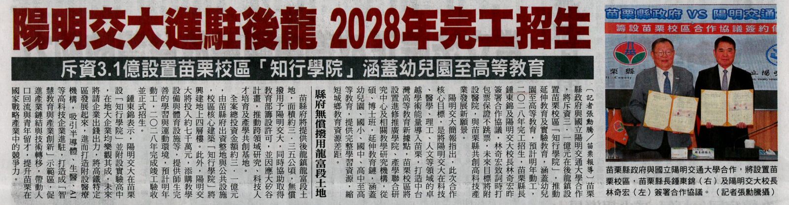 陽明交大進駐後龍 2028年完工招生